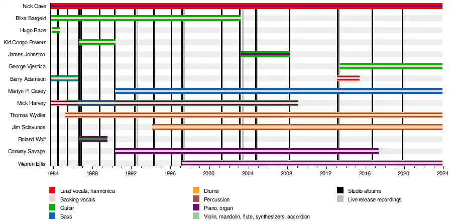 Mullins took over keyboards in the touring lineup of the Bad Seeds from Adamson in early 2015 and substituted Wydler as drummer for the 2022 European Tour.[15] | |