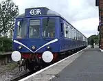 | British Rail | Unit DMBS 51342 and DMS 51384 Set No - | Class 117 | The railway has the two driving cars from what was a three-car Class 117 DMU. There were 127 of this type of vehicle and they were delivered new in 1959 to Southall depot working services between Paddington and the suburbs. They continued to be based in the London area until withdrawal in the 1990s, they arrived at the Railway in 2004. Each coach has two Leyland diesel engines underneath, which drive the wheels mechanically through a fluid flywheel. The driver's cab at each end of the unit means it can be driven from either end, making it ideal when running to Coopersale, and speeding up turn-around times. The windows in the ends mean passengers in either coach get an excellent view of the line ahead or behind and also get to watch the driver in action. The unit ran in an unusual dark blue and white 'EOR' livery until 2007, when it was taken out of service by the new owner when services were suspended. The interior has been refurbished, the unit is receiving attention to the exterior bodywork. DMBS is being restored; DMS is in service twinned with a Class 121 unpowered driving trailer.[16] | ![]() |