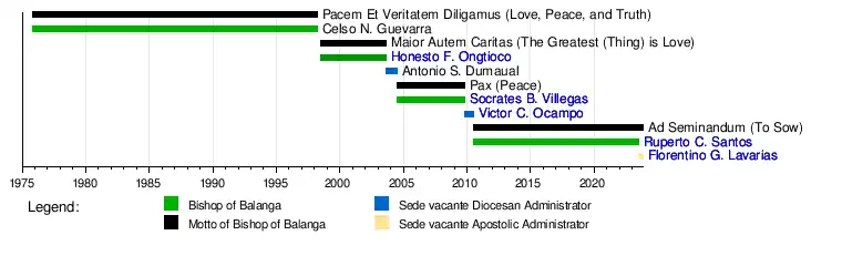 The dates shown below are when the Diocese of Balanga used a particular bishop's coat of arms including sede vacante period serving as a placeholder while awaiting for the installation of a successor and unveiling of the successor's coat of arms.