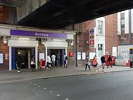 Romford railway station is an interchange station on the Great Eastern Main Line, serving the town of Romford in the London Borough of Havering, east London. It is 12 miles 30 chains (19.9 km) down the line from London Liverpool Street and is situated between Chadwell Heath and Gidea Park. It is also the northern terminus of a branch line to Upminster operated by London Overground. Its three-letter station code is RMF and it is in Travelcard Zone 6.