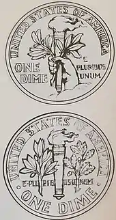 The models initially submitted by Sinnock showed a bust of Roosevelt on the obverse and, on the reverse, a hand grasping a torch, and also clutching sprigs of olive and oak. Sinnock had prepared several other sketches for the reverse, including one flanking the torch with scrolls inscribed with the Four Freedoms. Other drafts showed representations of the goddess Liberty, and one commemorated the United Nations Conference of 1945, displaying the War Memorial Opera House where it took place.[13] Numismatist David Lange described most of the alternative designs as "weak".[14] The models were sent on October 12 by Howard to Gilmore Clarke, chairman of the commission, who consulted with its members and responded on the 22nd, rejecting them, stating that "the head of the late President Roosevelt, as portrayed by the models, is not good. It needs more dignity."[10] Sinnock had submitted an alternative reverse design similar to the eventual coin, with the hand omitted and the sprigs placed on either side of the torch; Clarke preferred this.[15]