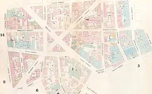 Roosevelt Street was a street located in the Two Bridges district of Lower Manhattan, which existed from the British colonial period up until the early 1950s, running from Pearl Street at Park Row (Chatham Street) southeast to South Street.[1] It ran parallel to James Street, one block west.[2] The western end of Roosevelt Street later became the walkway from Park Row to the front entrance of the Chatham Green Apartments at 165 Park Row.