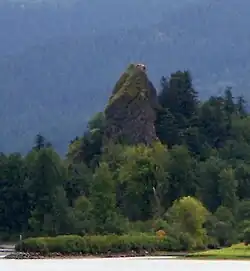 The monolith was mentioned in the journal of the explorers Lewis and Clark as their camping place on November 2, 1805.[2] The name is phallic in origin,[2] specifically, the column's original name was "Cock Rock". The Chinook word for the rock was iwash, referring to penis.[3] The name was later modified to Rooster Rock so as not to offend the public.[3]