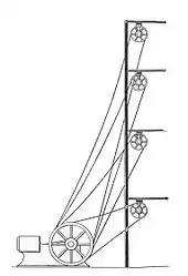 US practice sometimes used a single rope, looped between floors and tensioned by an idler pulley, but this system was not used in the UK and each loop was tensioned between its two pulleys by one of them being movable. Rope drives were also cheaper than belts - around a quarter of the price.[5]