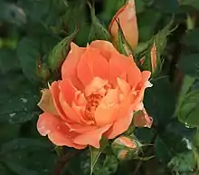 'Bridge of Sighs' is a large flowered climbing rose with glossy, medium green foliage. It typically grows up to 10 ft in height (305 cm) and ranges from 3 to 4 ft (91–121 cm) in width. It bears semi-double (9-16 petals) showy flowers in clusters of 3 to 7 flowers. The rose has a strong fruity fragrance. Blooms have an average diameter of 2-3 in (5—7.6 cm). Flower color varies from apricot to an apricot-blend.[7] The climbing rose blooms early in the season. It is a reliable repeat bloomer from summer to autumn. It also has very flexible canes, which makes it easy to train. It is suitable for all soil types.[8][6]
