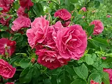 'Henry Kelsey' is a tall, climbing Hybrid Kordesii rose variety, 4 to 9 ft (1.2–2.7 m) in height, with a 5 ft (1.5 m) spread. It has a high-centered, semi-double cupped bloom form of medium-sized 3 in (76 mm), bright crimson petals with golden stamens.[1] The rose has a strong, fruity scent. It blooms in medium-sized clusters of 5–15 flowers. The first flowering is profuse and the plant will then flower occasionally throughout the season but in smaller numbers. It is susceptible to blackspot. 'Henry Kelsey' has abundant thorns and prickles and dark green, glossy foliage. In warmer climates, the rose can be grown as a climber, and will reach up to 13 ft (4.0 m).[2][3]