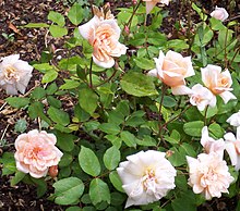 Polyantha roses were created by crossing China roses with dwarf, repeat flowering Rosa multifloras. The first hybrids developed were single flowering varieties, but the second generation produced repeat flowering roses. When Tea roses were later used in breeding Polyanthas, prettier dwarf roses were produced. 'Cécile Brünner' and Perle d'Or are excellent examples of this kind of hybridization. Both have a loose growing habit, hybrid-tea shaped flowers and are still popular roses in the 21st century. Polyanthas reached their peak of popularity in 1909 and were surpassed by Hybrid teas and Hybrid Perpetuals.[7] Rambaux created 'Perle d'Or' from a cross between a double-flowered R. multiflora seedling and the tea rose 'Madame Falcot' (Guillot, 1858). It is sometimes referred to as a China rose and sometimes considered a Polyantha. It is also known as 'Yellow Cécile Brünner'', as the pale apricot rose greatly resembles the related pale pink 'Cécile Brünner'.[4] 'Perle d'Or' was granted several awards, including the Lyon Gold Medal in 1883,[8] and the Royal Horticultural Society's Award of Garden Merit in 1993.[9]