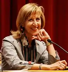 She positioned herself on the centre-left unequivocally throughout her time as a socialist activist.[16] Nevertheless, Rosa Díez has located herself on the centre-left and cross-sectionalism simultaneously since she left the PSOE,[17] defending what she deems progressive from anywhere on the left–right political spectrum vehemently and asseverating that the political centre, which can only be understood, to her mind, as moderation and equidistant space between left and right, is nothingness.[18][19] Furthermore, she defines herself as a "radical democrat" or, expressed differently, as a "pro-institutional leader whose radical politics, moderate in the process and revolutionary in essence, bothers the establishment", for she wants to "transform politics by bringing off substantial, in-depth changes from within institutions".[20] Hence, owing to her self-proclaimed cross-sectionalism and radicalism, Rosa Díez has been linked to radical centrism.[21][22][23]