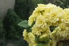 A number of other forms were subsequently discovered growing in China, including R. banksiae var. normalis (see above), and R. banksiae 'Lutea', the yellow Lady Banks' rose (brought to Europe in 1824 by J. D. Parks). In 1993 this cultivar earned the Royal Horticultural Society's Award of Garden Merit.[8] It is used in traditional Chinese medicine, with portions of other plants and herbs (such as monkshood and Ligusticum wallichii) to make a liniment to treat a painful swelling of the joints.[9]