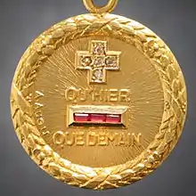 This couplet is taken from a poem, variously known as "L'éternelle chanson" ("The Eternal Song") or "Les Vieux" ("The Old Ones"), that she wrote to Rostand in 1889.[4] The poem was published in 1890, but did not enjoy immediate success. The phrase became celebrated as an expression of ever-growing love when, in 1907 (17 years after its publication), a Lyonnais jeweler, Alphonse Augis, had the idea of making a medallion with the core portion of the verse engraved on it.[5] The medallions became quite popular, and led to the production of other, similarly decorated jewelry items, such as earrings and matchboxes; many older examples include Augis' name. A very common variation on the design presents the line with the words "plus" and "moins" replaced by the mathematical + and − signs, respectively. The mathematical signs are frequently rendered in tiny gemstones, often in contrasting colors.[6]