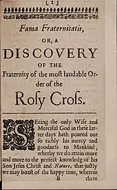 Between 1610 and 1615, two anonymous manifestos appeared in Germany and soon after were published throughout Europe. The Fama Fraternitatis Rosae Crucis (The Fame of the Brotherhood of the Rosy Cross) was published at Cassel in 1614, though it had been circulated in manuscript among German occultists since about 1610. Johannes Valentinus Andreae has been considered the possible author of the work.[1] A literal reading narrates the travels and education of "Father Brother C.R.C." and his founding of a secret brotherhood of similarly prepared men. Names, numbers, and other details have Cabalistic allusions, in which the cognoscenti of that era were well versed. The Confessio Fraternitatis (The Confession of the Brotherhood of RC), published in Frankfurt in 1615, responded to confusions and criticisms and elaborated the matter further.[2]