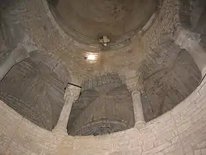 The upper matronaeum has also eight columns which creates a circular ambulatory facing the central hollow of the lower section. It has also a small apse with traces of frescoes. The capitals on both floors, and the portal, have well sculpted zoomorphic, human and geometric figures.