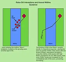 In the vertebrate spinal cord, Robo1 and Robo2 are expressed on commissural axons and act as repulsive receptors for the Slit ligands expressed by floor plate cells located at the midline.[11] In contrast, Robo3/Rig1 is required for midline crossing, and acts in part by antagonizing Slit-mediated repulsion by Robo1 and Robo2.[23]
