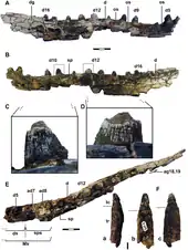 Roxochampsa was originally described as a new species of Goniopholis, G. paulistanus, in 1936, based on two teeth (DGM 259-R and DGM 258-R) and a tibia (DGM 225-R), all from the Adamantina Formation of São Paulo state, Brazil.[2] However, Andrade et al. (2011) rejected referral of the species of Goniopholis and treated it as a nomen dubium referable to Neosuchia indeterminate.[3] Pinheiro et al. (2018) described new jaw material from the Presidente Prudente Formation of the Alfredo Marcondes municipality in São Paulo state, and noted that the tooth crowns in the jaw material morphologically matched the teeth in the syntype series of G. paulistanus. They erected Roxochampsa for the species, designating DGM 259-R and DGM 258-R as the lectotype and paralectotype respectively, while assigning the tibia (collected at a different locality than the teeth) to Sebecosuchia indeterminate.