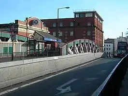 There had been a locomotive depot at Westbourne Park since 1855, which was replaced by the Old Oak Common depot in 1906.[30] To avoid the need for locomotives to make the 6-mile (9.7 km) round trip from Paddington just to be turned, coaled and watered, a small maintenance facility for locomotives was constructed on the southern side of the line, directly opposite Royal Oak station, which occupied part of the site of Westbourne Lodge and its grounds. It was known as Ranelagh Bridge depot, and opened in 1907.[31] There was a turntable, a water tower, a coaling stage and sidings where about 15 locomotives could be held awaiting their next trip west.[32] The turntable was removed in April 1964, and the depot facilities were altered to suit Diesel locomotives; the depot closed in 1980.[33]