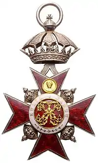 The insignia of Commander is identical to that of Grand Cross, except the Commander wears only the sash. In addition, on the badge the crowns between the arms of the cross are silver, not gold.