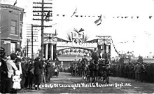 The Canadian portion of the 1901 royal tour began 16 September 1901, when the RMS Ophir arrived in Quebec City.[75] The royal party – which consisted of 22 people, landed at Quebec City on 16 September. During his time in Quebec City, Prince George invested Lieutenant Richard Ernest William Turner with the Victoria Cross for his conduct during the Battle of Leliefontein in a ceremony at the Plains of Abraham, and spoke to students at the Université Laval.[78] Moving west of Quebec City by railway, the group made stops to Montreal, and Ottawa.[79] Throughout the royal tour, Prince George placed an emphasis on praising the creation and expansion of the country during his own lifetime, giving a speech about the country's development and growth in Ottawa and Winnipeg.[80]