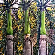 Roystonea regia produces unisexual flowers that are pollinated by animals.[7] European honey bees and bats are reported pollinators.[7][23] Seeds are dispersed by birds and bats that feed upon the fruit.[7]