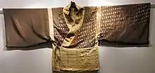 The ru,[45] shan, and ao were common garment items for women in the Tang dynasty.[46] The ru (as a short jacket) and shan (as an unlined short robe) were used for ceremonial and daily clothing by women.[47] Some jackets in Tang dynasty could be found with narrow sleeves,[5] while other upper garments could be found with loose sleeves.[43] The Tang dynasty ru could also be a tight jacket or a cotton-padded jacket, which could have embroidered golden line as embellishment at the collar and sleeves or could sometimes be decorated with silk damask.[48] Duijin shan were also worn by women in this period;[49]:3[50] a form of duijin shan was the daxiushan which became popular when the Hufu-style declined in popularity.[51]:94
