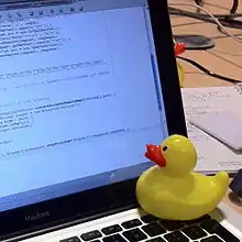 In software engineering, rubber duck debugging (or rubberducking) is a method of debugging code by articulating a problem in spoken or written natural language. The name is a reference to a story in the book The Pragmatic Programmer in which a programmer would carry around a rubber duck and debug their code by forcing themselves to explain it, line by line, to the duck.[1] Many other terms exist for this technique, often involving different (usually) inanimate objects, or pets such as a dog or a cat. Teddy bears are also widely used.[2]