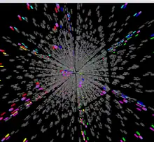 Another alternate-dimension puzzle is a view achievable in David Vanderschel's Magic Cube 3D. A 4-cube projected on to a 2D computer screen is an example of a general type of an n-dimensional puzzle projected on to a (n – 2)-dimensional space. The 3D analogue of this is to project the cube on to a 1-dimensional representation, which is what Vanderschel's program is capable of doing.