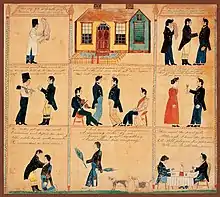 For many years, the only works known by Finch, besides the Kirby family register, were a series of half- and full-length portraits as well as two serial illustrations of the parable of the Prodigal Son. All are in watercolor, and evince a willingness to experiment; her portraits, especially, are distinguished by their individualistic details of costume and physical characteristics. She valued decorative qualities, and tended to avoid repetition; even repeated motifs are delineated by their varied poses. Her portraits incorporate plinths among their compositional devices.[1] More recently, four more drawings were discovered among the effects from two former Devol family farms; also discovered was the only known photograph of Finch, taken six years before her death.[2] Most of her work appears to have been produced to commemorate marriages or deaths, among other such personal occasions. Finch appears to have been accepted by her neighbors as a community artist, and many of her pieces depict neighbors and friends.[3]