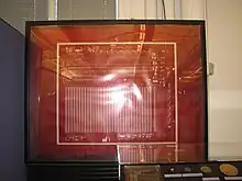 Rubylith was used in the early days of semiconductors and integrated circuits manufacturing as stencils to make photomasks (reticles).[2] The physical layouts of the first generations of Intel microprocessors were first hand drawn on graph paper. A technician would then use a coordinatograph to precisely cut the rubylith (laminated onto a transparent plastic such as mylar) and a knife (X-Acto) to peel the appropriate sections away while it was resting on the light table. The finished Rubylith mechanical masters were then photo reduced (onto a photographic film) up to 100 times and then step and repeated on to glass plates for production use. Usually, several such masks were made that were then used layer by layer.
