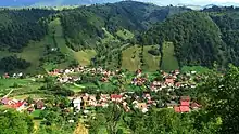 ![]() The Bucegi Mountains as seen from the village of Moieciu in the Rucăr–Bran Pass | |