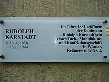 With a loan of 1000 thaler from his father and with the help of his two sisters, Karstadt opened his first store, ″Tuch-, Manufaktur- und Konfektionsgeschäft" at the Krämerstr. 4 in Wismar on 14 May 1881.[2]