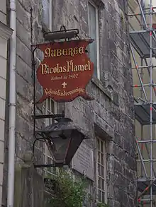 The house of Nicolas Flamel, at No. 52, which was built in 1407 by Nicolas Flamel himself still stands, the oldest stone house in Paris, at 51 rue de Montmorency;[5] the ground floor, always a tavern, currently houses the Auberge Nicolas Flamel. Nicolas Flamel, a scrivener and manuscript-seller who developed a reputation as an alchemist, claimed that he made the Philosopher's Stone which turns lead into gold, and that he and his wife Pernelle achieved immortality. Engraved images were discovered during recent works on this house.