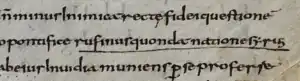 The Syrian Rufinus is usually identified with the Rufinus who wrote the Liber de fide (Book of Faith), which survives in a single manuscript, now MS Q. v. 1. 6 in the Saint Petersburg Public Library. The manuscript describes the author as a priest from the province of Palestine. In this work Rufinus attacks Arianism, Origenism and the doctrine of original sin. The work was for a long time ascribed erroneously to Tyrannius Rufinus.[1] The latter, also called Rufinus of Aquileia, was definitely a different person.[2]