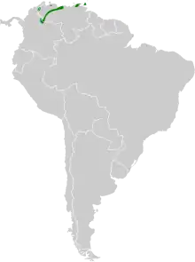The nominate subspecies of rufous-shafted woodstar is found in northeastern Venezuela's Sucre and Monagas states and, according to some taxonomies, in Trinidad as well.[6][8] However, the South American Classification Committee of the American Ornithological Society lists it as resident in Venezuela but only a vagrant to Trinidad.[9] Subspecies C. j. rosae is found in northern Venezuela between the states of Falcón and Miranda. C. j. andinus is found in the Sierra de Perijá that straddles the border between Colombia and Venezuela, the eastern Andes of Colombia, and the Andes of Venezuela between Táchira and Lara states.[8]