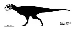 Rugops (meaning ‘wrinkle face’) is a monospecific genus of basal abelisaurid theropod dinosaur from Niger that lived during the Late Cretaceous period (Cenomanian stage, ~95 Ma) in what is now the Echkar Formation. The type and only species, Rugops primus, is known only from a partial skull. It was named and described in 2004 by Paul Sereno, Jeffery Wilson and Jack Conrad. Rugops has an estimated length of 4.4–5.3 metres (14.4–17.4 ft) and weight of 410 kilograms (900 lbs). The top of its skull bears several pits which correlates with overlaying scale and the front of the snout would have had an armour-like dermis.