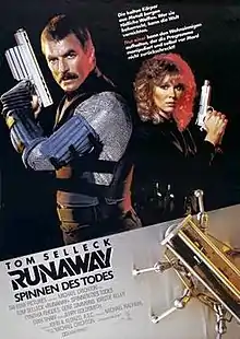 Runaway is a 1984 American science fiction action film written and directed by Michael Crichton, starring Tom Selleck, Gene Simmons, Cynthia Rhodes and Kirstie Alley. Selleck portrays a police officer assigned to track down dangerous robots, while Simmons is a scientist who hopes to profit from his manipulation of robots. The film was a box office disappointment and received mixed reviews.