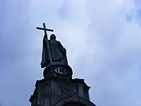 The origins of the Rurikids are unclear, as its namesake Rurik, a Varangian prince who allegedly founded the dynasty in 862 through the "Calling of the Varangians", is considered to be a legendary, mythical and perhaps even entirely fictional character by modern scholars.[lower-alpha 2] Nicholas V. Riasanovsky (1947) stated: '...no Kievan sources anterior to the Primary Chronicle (early twelfth century), knew of Riurik. In tracing the ancestry of Kievan princes they usually stopped with Igor.'[18] As an example, Hilarion of Kiev's Sermon on Law and Grace (1050s), praising Volodimer I of Kiev, only goes back to his father Sviatoslav I and grandfather Igor of Kiev.[19] Even if Rurik did exist, scholars have long doubted or rejected his paternity of Igor.[lower-alpha 3] The connections between Rurik, Oleg and Igor, as attested in the Primary Chronicle and Novgorod First Chronicle, are tenuous at best; in all other cases, these two chronicles base any particular ruler's legitimacy on the fact that their father or grandfather previously "sat on the throne in Kiev", and never refer back to Rurik.[21] Legitimacy in the Kievan Chronicle is also heavily based on a ruler being descended from his father and grandfather, with the exception of two 5-generation lists.[lower-alpha 4] Before the mid-15th century, no historical source claims that Rurik founded a dynasty;[24] the Hypatian Codex of c. 1425 began its list of knyazi of Kiev with "Dir and Askold", then "Oleg", then "Igor", up to 1240, and does not mention Rurik anywhere.[25] It was not until the 16th century that Rus' churchmen developed an explicit tradition,[24] described in the 1560 Book of Royal Degrees by Macarius, Metropolitan of Moscow, according to which the reigning Danilovichi house of the Grand Duchy of Moscow (Muscovy) was part of a "Rurikid dynasty", which not only traced back all the way to the legendary Rurik, but was purportedly descended from a certain Prus, a supposed kinsman of Augustus Caesar.[24] According Ostrowski (2018), the Rus' churchmen developed this concept of a R(i)urikid dynasty for the purpose of "bolstering the Muscovite dynastic state".[26] Although many later historians would accept the 16th-century Rus' churchmen's dynastic claim that the Danilovichi were descended from Rurik, they did not accept Prus as the ancestor of the Muscovite princes.[1] Because of these issues, various scholars have instead named the dynasty the Volodimerovichi, descendants of grand prince Volodimer I of Kiev.[27][16]