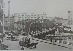 While there is currently no bridge along Rush Street at the main stem of the Chicago River, the main stem has through its history been crossed by four bridges at Rush Street. The first bridge was a floating bridge that was hinged to one bank. Ropes were used to open and close this bridge.[6] A March 1849 ice storm was the first of two instances in which all bridges on the main stem of the Chicago River were destroyed overnight. An iron and timber swing bridge with center supports was built in 1857 at a cost of $48,000. The bridge stood until, on November 3, 1863, a passing ship's whistle spooked a herd of cattle that was crowding the bridge and stampeded into the river.[7] The bridge was repaired and still in use on October 8, 1871 when it was destroyed in the Great Chicago Fire. In 1872 the Detroit Bridge and Iron Works company built a wrought-iron replacement that stood until 1883, when a barge struck and collapsed the bridge.[6] It was replaced by another swing bridge that lasted for several decades until after the Michigan Avenue Bridge was built in 1920.[7] This final 1884 bridge had trusses measuring 30 feet (9.1 m) in the center and 20 feet (6.1 m) on the ends. Its deck used 4-inch (100 mm) white pine planks.[6]