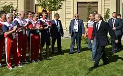 | Team Russia at the opening ceremony, 12 June 2015 | President of Russia Vladimir Putin with the Russian team | Putin and Minister of Sports Vitaly Mutko meet the Russian team | Mutko, Putin, Zhukov (President of the ROC) with the Russian athletes |
