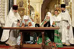 On December 28, 2006, the leaders officially announced that the Act of Canonical Communion would be signed. The signing took place on May 17, 2007, followed immediately by a full restoration of communion with the Moscow Patriarchate. It was celebrated by a Divine Liturgy at the Cathedral of Christ the Savior in Moscow, at which the Patriarch of Moscow and All Russia Alexius II and the First-Hierarch of ROCOR concelebrated for the first time in history.