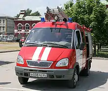 Russian State Fire Vehicles are painted in accordance with GOST R 50574-2002 (ГОСТ Р 50574-2002 г)[5] which requires an overall flame-red (in practice red-orange) with contrasting white doors, white bumpers, white front and rear vertical stripes and white horizontal side stripes. Undercarriages are painted black. Auxiliary vehicles lack the white doors. Any writing or numbers are of the opposite color of the color it is on.