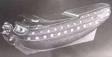 Decor of Poltava was typical of the time. Its main theme was glorification of the Russian victory over the Swedes at the Battle of Poltava.[15] The rear was more round than the pyramidal Dutch shapes. Another distinction of Poltava from contemporary ships was the lack of a walking gallery across the stern. Instead, it featured a protruding balcony with a half-dome roof.[14] It also had two rows of windows with small panes, one above the balcony and one running across it.[3] All the sculptures and decorations of the stern were repeated twice in a mirror fashion. An oval cartouche with the name of the ship was positioned in the center of the top part. The cartouche was framed by palm branches and flanked by two sitting glories blowing the trumpets. A naiad further to the ship edge was giving a laurel wreath to each glory. The balcony was flanked by two 82×75 cm figures of Saint George slaying the dragon.[16] Further toward the edges there were two figures of falling head-first Phaëton, which meant to allegorically depict Charles XII of Sweden.[14] The balcony featured a large double-headed eagle holding in its beaks and claws maps of the four seas to which Russia gained access during the rule of Peter I.[14] The panels left and right to the eagle contained a traditional arrangement of flags, guns and spears, with heads of Zephyrus "sending winds of victory to the Russian flags".[14][16] The figurehead most likely represented a lion holding in its claws a shield with a double-headed eagle on it.[14][17]