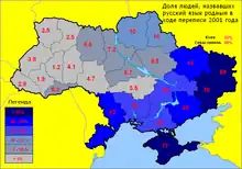 The Ukrainian language was hit the most by the Russification. Russification policy was more intense in Ukraine than in other parts of the Soviet Union, and the country now contains the largest group of Russian speakers who are not ethnically Russian: as of 2009, there were about 5.5 million Ukrainians whose first language was Russian. Russian speakers are more prevalent in the southern and eastern half of the country, while Ukrainian is more used in central Ukraine (excl. bigger cities, like Kyiv or Poltava) and Ukrainian dominates in western Ukraine, having almost no Russian speakers and ethnic Russians.[14] Some of these "russified Ukrainians" speak Russian, while others speak a mix of Ukrainian and Russian known as "surzhyk"; many Ukrainian speakers recognize "surzhyk" as a bigger problem than Russian, because it ruins the Ukrainian language and is a mix of Ukrainian and Russian vocabulary and grammar.[15] Estimates of the "russified Ukrainians" prevalence in the country vary, but according to different studies, "russified Ukrainians" comprise a third to a half of the total population of Ukraine.[16] Generally, Ukrainian dominates in the villages in the whole country; even in eastern Ukraine, Ukrainian is common in villages, where it's actually considered to be the real "clean" Ukrainian without any influence from other languages.[17] However, the only part of Ukraine, where Ukrainian completely dominates and Russian is rare to hear, is western Ukraine (especially Galicia). That's because western Ukraine is the only part of Ukraine, that wasn't a part of Russia for a long time, like the rest of the country. A part of western Ukraine (e.g. Volhynia) became a part of the Russian Empire for the first time around the 1800s, while Galicia, Bukovina and Zakarpattia fully became a part of the Soviet Union for the first time just in 1945, after WW2.
