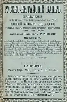 The bank immediately opened a branch in Shanghai in February 1896.[8] On 28 August 1896 it partnered with the Chinese imperial government for the construction of the Chinese Eastern Railway, acting as a conduit for project financing from the Russian government, and also receiving capital financing from the Chinese authorities - the only time ever that the Qing empire was involved in the capital of a foreign enterprise.[2] In Chinese, the bank was then referred to as "Sino-Russian Righteousness Victory Bank" (Traditional Chinese: 華俄道勝銀行).[9][8] By 1902, it had become the second-largest bank in China.[8] In 1898, the State Bank of Russia took a significant share of the bank's newly issued capital.[2] The Russian interests subsequently prevailed in the bank's management, and its French stakeholders were marginalized. The Russo-Chinese Bank's activity had initially been focused north of the Yangtze in order not to compete further south with the French-sponsored Banque de l'Indochine, but the bank breached that arrangement by opening a Hong Kong office in 1904.[6]