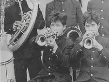 In 1936, NHK started radio program "Kokumin Kayō" (国民歌謡, lit. "National Kayō") to compete with ryūkōka, which was under the influence of "Ero Guro Nansensu", but it soon began to air war songs around July 1937.[18] The program was renamed to "Warera no Uta" (われらのうた, lit. "Our Songs") in 1941 and then "Kokumin Gasshō" (国民合唱, lit. "National Group Singing") in 1942.[18] The songs during the war were called "Senji Kayō" (戦時歌謡). During the war, many musicians were forced to write war songs. Yuji Koseki composed many war songs and was later criticised as a war collaborator, though he seemed to be touched with remorse.[25] Koseki composed "Roei no Uta" (露営の歌, lit. "Song of the Camp") released in 1937. Although the song was a B-side song, it sold 600,000 copies.[26] The 1937 song "Aikoku Kōshinkyoku" (愛国行進曲, lit. "Patriotic March") sold 1,000,000 copies.[27] However, Japanese jazz musicians such as Ryoichi Hattori seemed to be vigorless to compose war songs.[28] His son Katsuhisa Hattori claimed that he was not an antinationalist and he technically were hardly not able to compose war songs even if they wanted to make those because Japanese war songs were musically enka.[28]