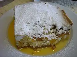 In Slovak and Czech cuisine, ryžový nákyp (Slovak pronunciation: ['riʐɔʋiː naːkip]; Czech: rýžový nákyp, Czech pronunciation: ['rɪ:ʒoviː naːkɪp], translate to “rice cake”) is a cake-like rice pudding made of rice, milk, eggs, butter, and sometimes raisins or other dried fruit.[1] It is usually served with apricot, peach, plum, cherry or other fruit compote, or sprinkled with powdered sugar, or topped with beaten egg white.[1] It may be served as a second course, a main dish[2] or a dessert.[3] It may be served warm or cold.[1]