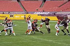 On November 22, 2020 against the Washington Football Team, Finley came into the game in the third quarter after starter Joe Burrow left the game with a left leg injury.[18][19] Finley completed 3 of 10 passes for 30 yards, an interception, and a 0.0 passer rating as the Bengals lost 9–20.[20] The following week, Bengals coach Zac Taylor named Brandon Allen the starting quarterback over Finley.[21] Finley was named the starter for the Week 15 matchup against the Pittsburgh Steelers. Finley passed for 89 yards and a touchdown, and had 47 yards rushing, including a 23 yard rushing touchdown during the 27–17 win against the heavily favored Steelers, marking Finley's first win as an NFL quarterback.[22][23]