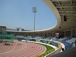 The stadium has two eight-lane tracks, one for warm-up activities. There are also two training halls, a fitness center and rooms for health care, doping test and press.[1]