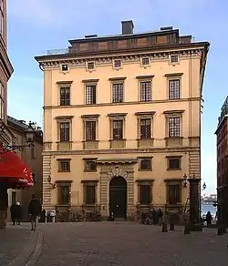 The façade is made of bright fair-faced plaster and sandstone supporting a Swedish manor-house roof (a Mansard-like roof) with an 'Italian' mezzanine. This 'Roman Renaissance' composition originating from France and Italy, depending on abstract geometry with bricks hidden by plaster, was to become the predominant style in the architecture of Stockholm until the 1870s. The central axis symmetrically passing through the vaulted and richly elaborated lobby, dissolving the contrast between interior and exterior, is clearly inspired by Andrea Palladio, the stairwells being very close to Palladio's both in construction and dimensions. Over and under the two 3,5 metres tall main floors are two mezzanine used for storage, a composition topped by an elaborated roof cornice.[3]