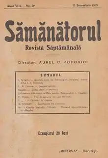 Sămănătorul or Semănătorul (pronounced [səmənəˈtorul / semənəˈtorul], Romanian for "The Sower") was a literary and political magazine published in Romania between 1901 and 1910. Founded by poets Alexandru Vlahuță and George Coșbuc, it is primarily remembered as a tribune for early 20th century traditionalism, neoromanticism and ethnic nationalism. The magazine's ideology, commonly known as Sămănătorism or Semănătorism, was articulated after 1905, when historian and literary theorist Nicolae Iorga became editor in chief. While its populism, critique of capitalism and emphasis on peasant society separated it from other conservative groups, Sămănătorul shared views with its main conservative predecessor, the Junimea society, particularly in expressing reserve toward Westernization. In parallel, its right-wing agenda made it stand in contrast to the Poporanists, a Romanian populist faction whose socialist-inspired ideology also opposed rapid urbanization, but there was a significant overlap in membership between the two groups. Sămănătorul's relationship with the dominant National Liberal Party was equally ambiguous, ranging from an alliance between Sămănătorul and National Liberal politician Spiru Haret to Iorga's explicit condemnation of 20th century Romanian liberalism.
