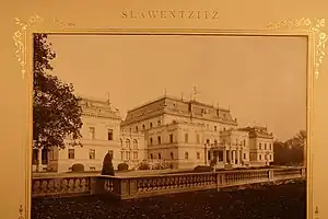 During the Second World War, the Hohenlohe family fled first to their summer palace in Oppurg[4] and later to Neuenstein in Hohenlohe. Since then, Schloss Neuenstein has remained the main residence of the princes up to this day. Schloss Slawentzitz with its park and greenhouses were severely damaged in the fights with the Red Army in January 1945. The ruins burnt down completely in 1948, but in the 1950s youth camps were still organized in its interiors. The palace was finally demolished in the 1970s.[7] Only an entrance portico remains.