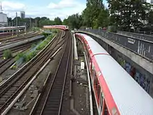 To ease the strain on the central Verbindungsbahn ("connection railway"), a second main connection was constructed, the City S-Bahn, which traverses the city centre in a tunnel. The first section was opened in 1975 between Hauptbahnhof and Landungsbrücken, the extension to Altona in 1979 and was completed in 1981 with the connection above ground to Diebsteich.[7] 1983 saw the opening of the line via Wilhelmsburg to Harburg Rathaus, a long stretch of which runs along the existing mainline. Through Hammerbrook the trains run on a concrete viaduct and in a tunnel under the centre of Harburg. The line was extended in 1984 along the Niederelbebahn to Neugraben.